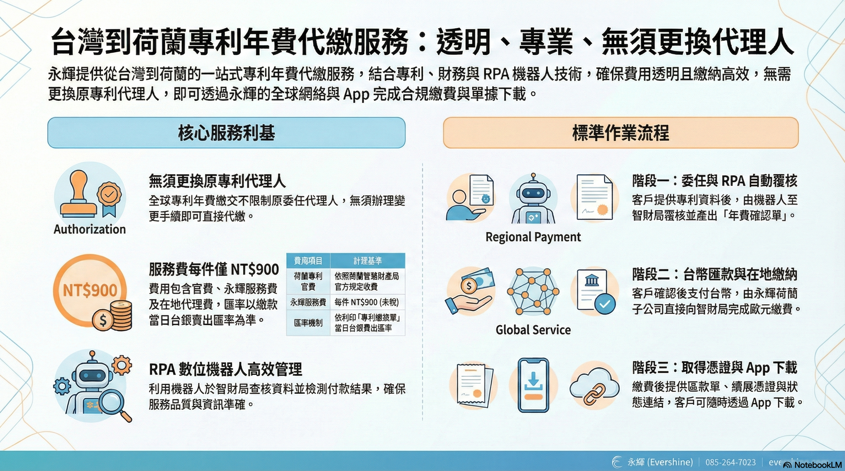 台灣企業或個人有荷蘭專利,永輝專利年費之代收代付服務流程為何?